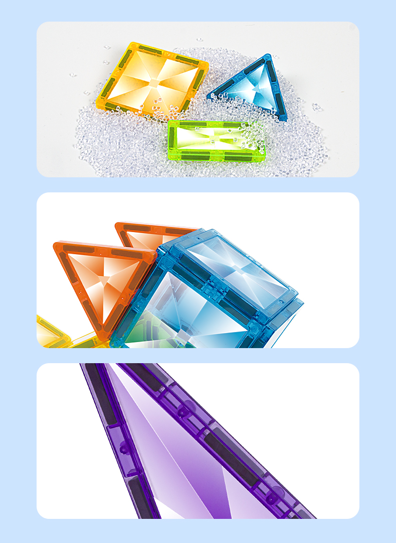 Droša, kvalitatīva un izturīga konstrukcija – katrs elements ir izgatavots no augstas kvalitātes, netoksiska un izturīga plastmasas materiāla. Noapaļotās malas un droši noslēgtie magnēti garantē drošību. Magnētiem ir ideāls stiprums – tie stingri notur būves, bet ļauj viegli savienot un izjaukt. Protams, ar drošības sertifikāciju.